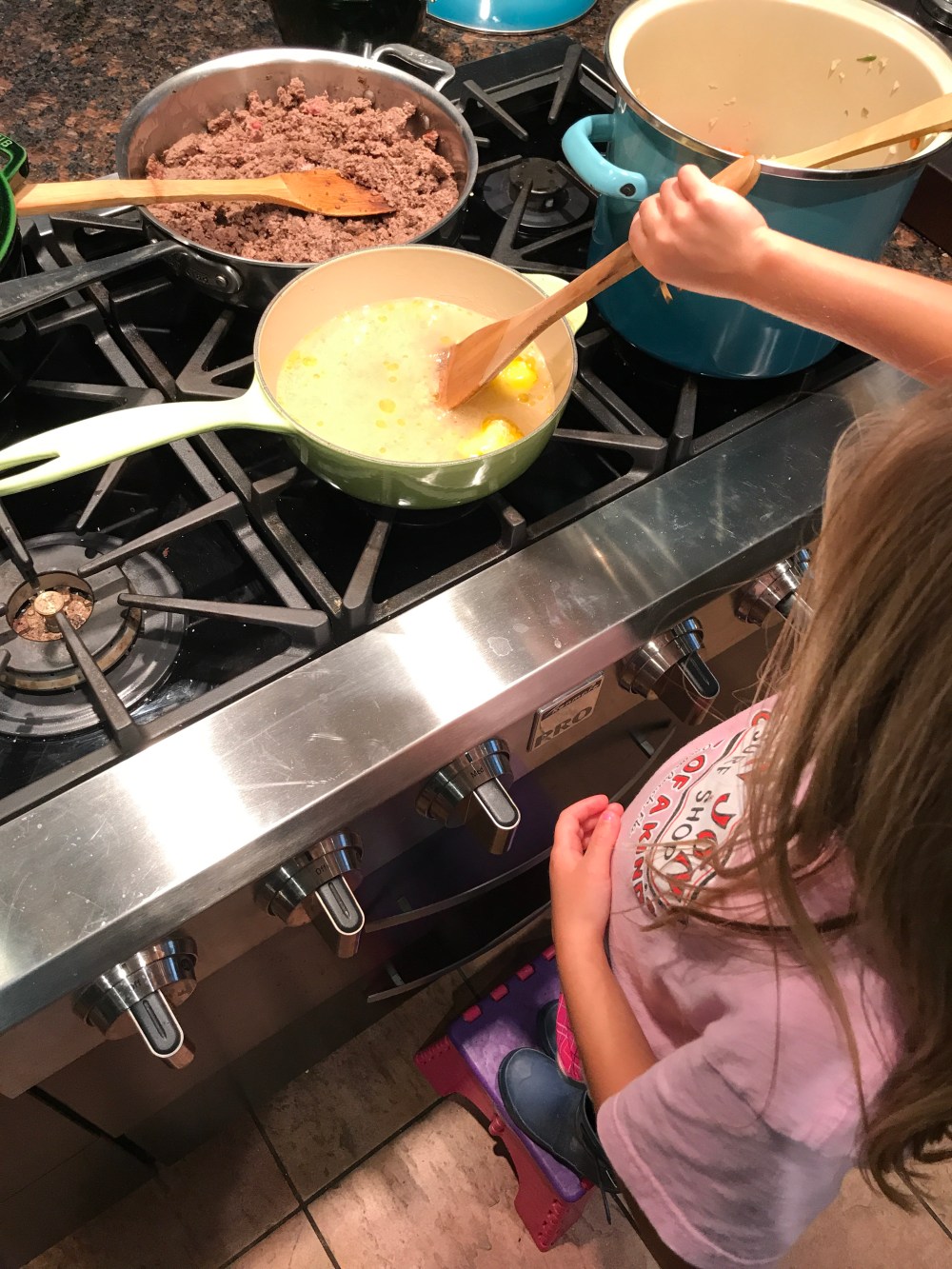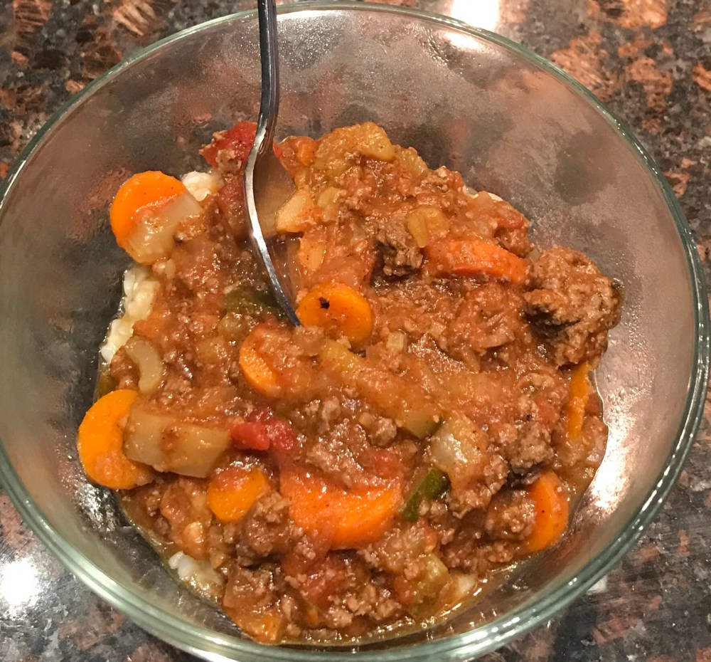 Sauté veggies & grass fed beef in 2 Tablespoons of olive oil. Then simmer 45 minutes. While veggies simmer 45 minutes cook rice. I used Two Brooks Farm Missimati Bayou Bouquet Brown Rice Basmati.