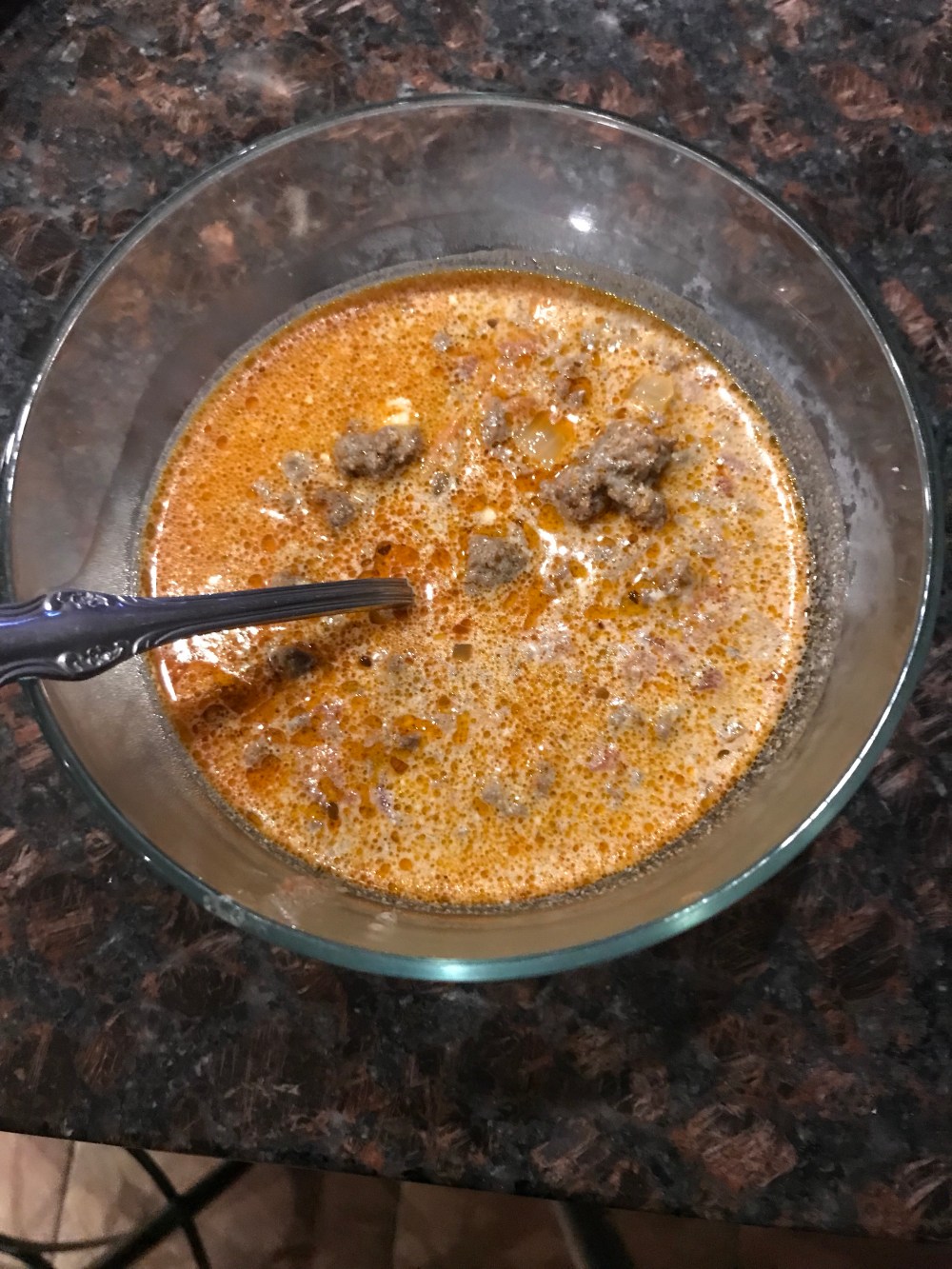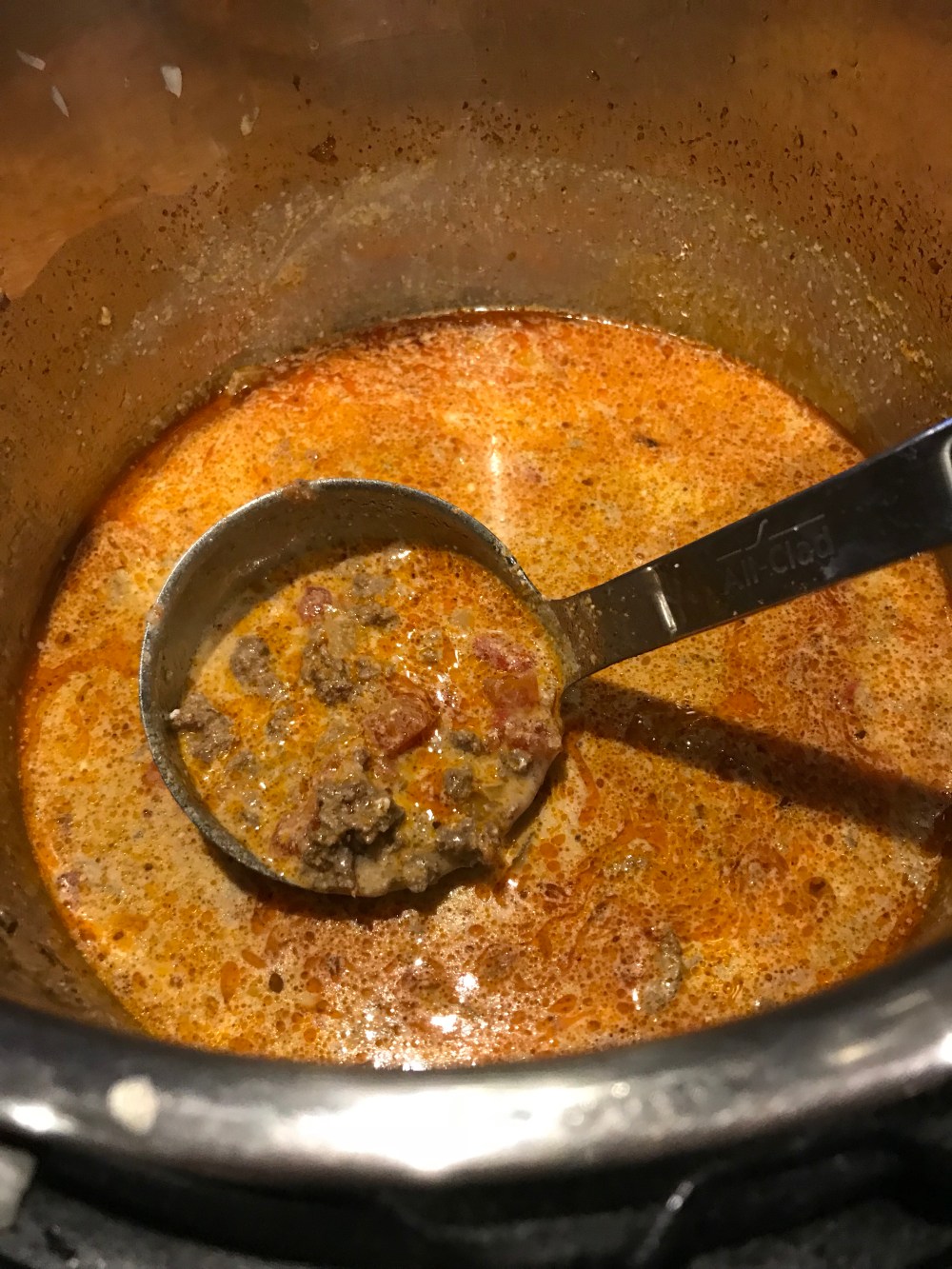 Sauté onion once translucent add garlic and ground beef. Once the ground beef is no longer red add spice. Next add Rotel tomatoes and beef broth. After 30 minutes stir in the cream cheese and yogurt. If you don’t have food allergies sour cream and cream cheese can be used. Salt and pepper to taste.