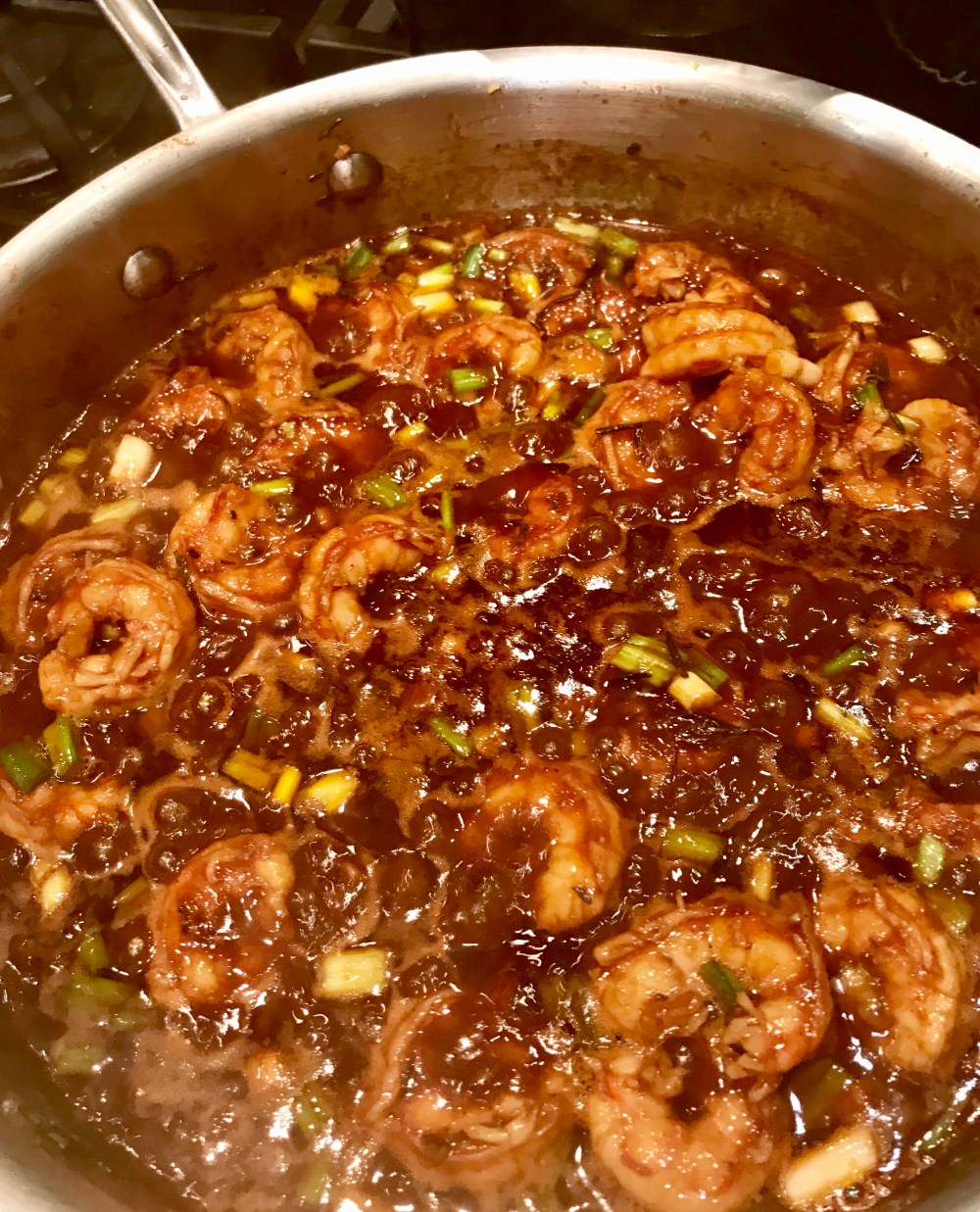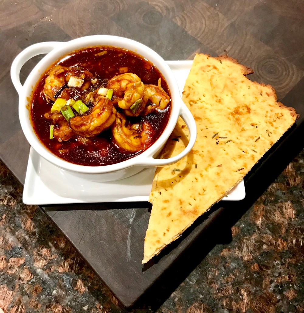 Melt ghee, olive oil in a medium skillet or sauté pan. Then sauté garlic and fresh rosemary. Then add shrimp sauté three minutes then reduce temperature. While on low stir in chili sauce, coconut aminos, lemon juice, and hot sauce. Simmer 5-8 minutes. Salt & Pepper to taste. Top with green onions. Traditionally served and sopped up with crusty French bread. We had rosemary flat bread!