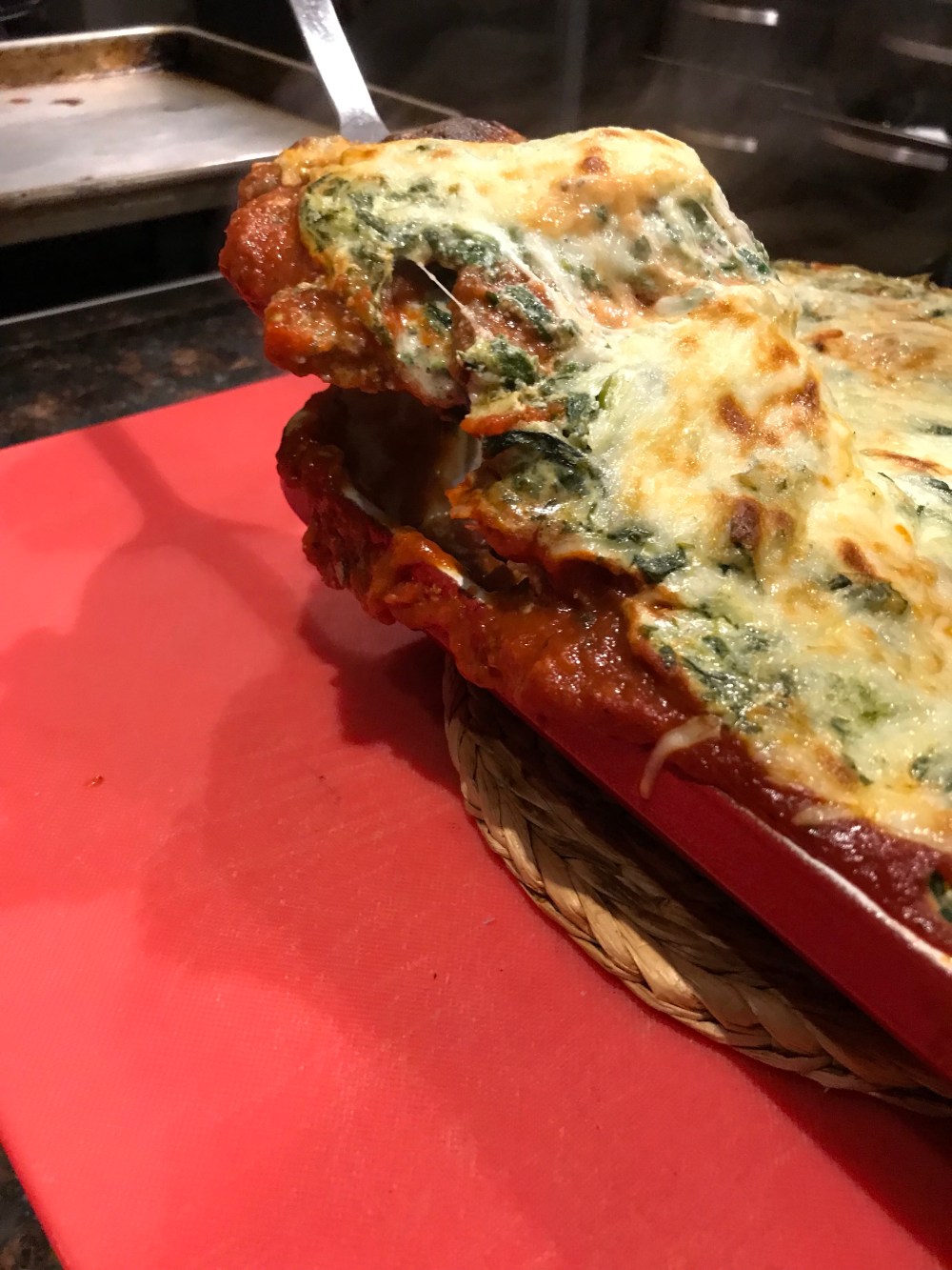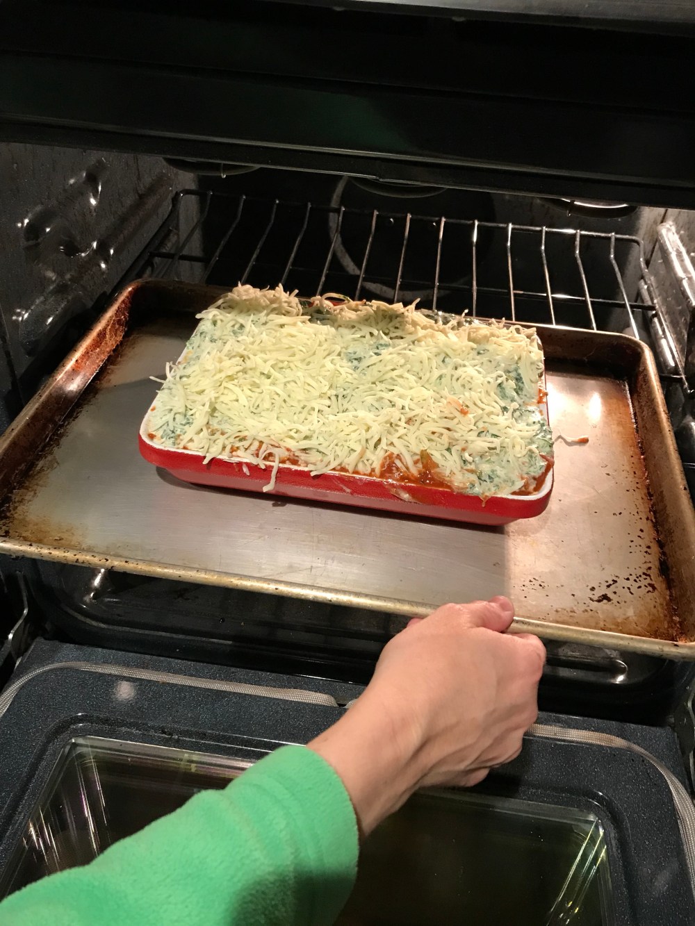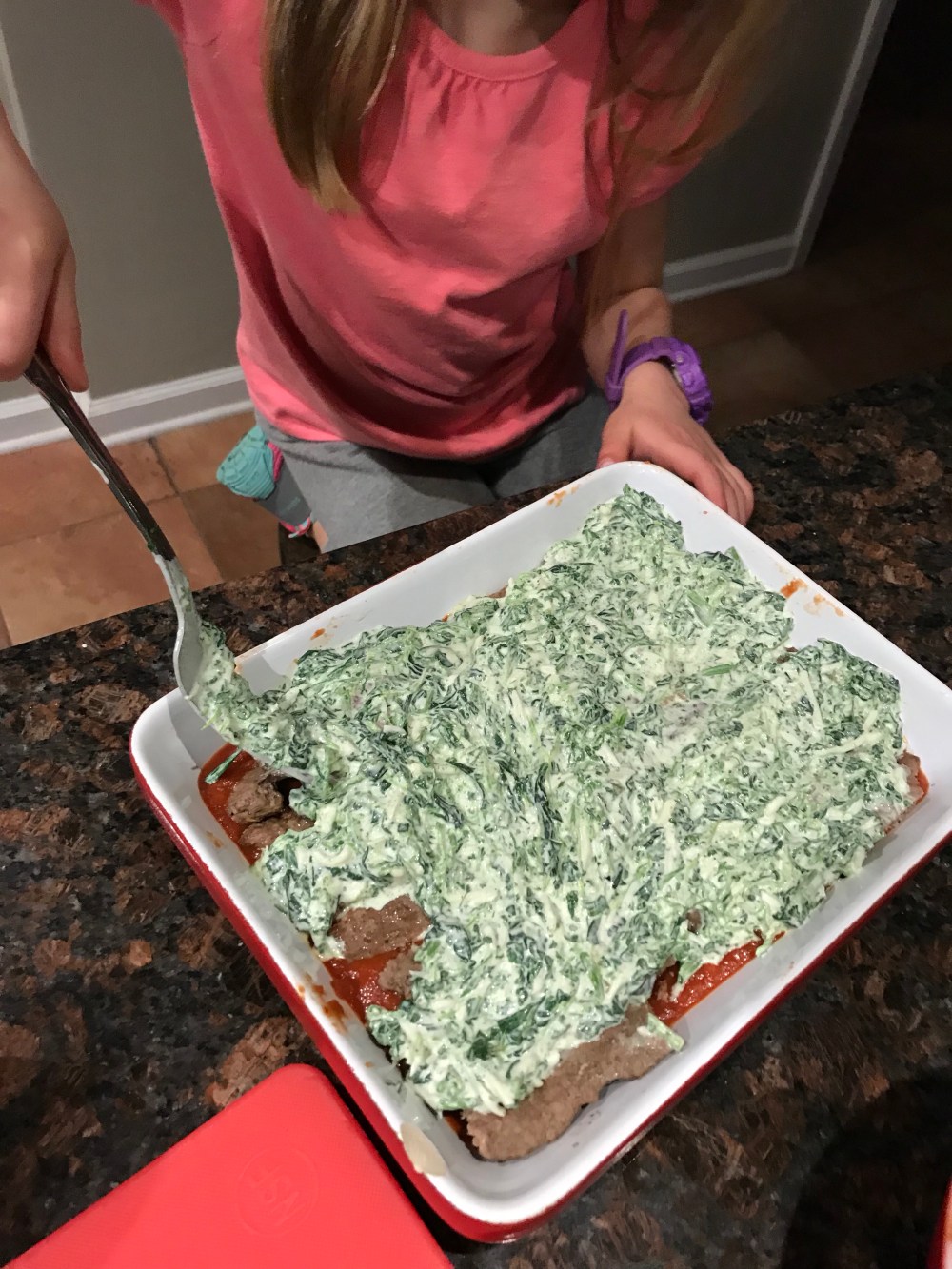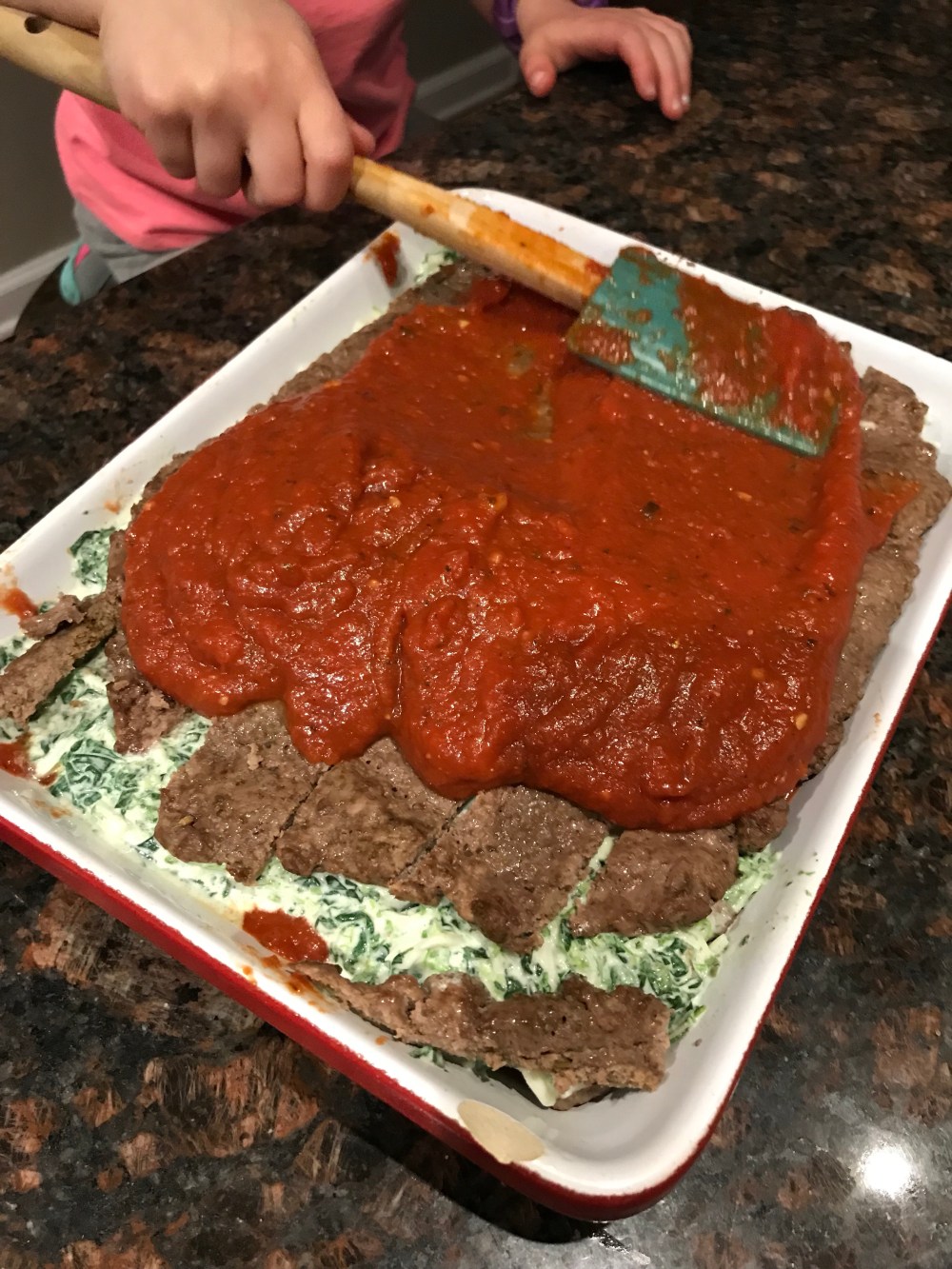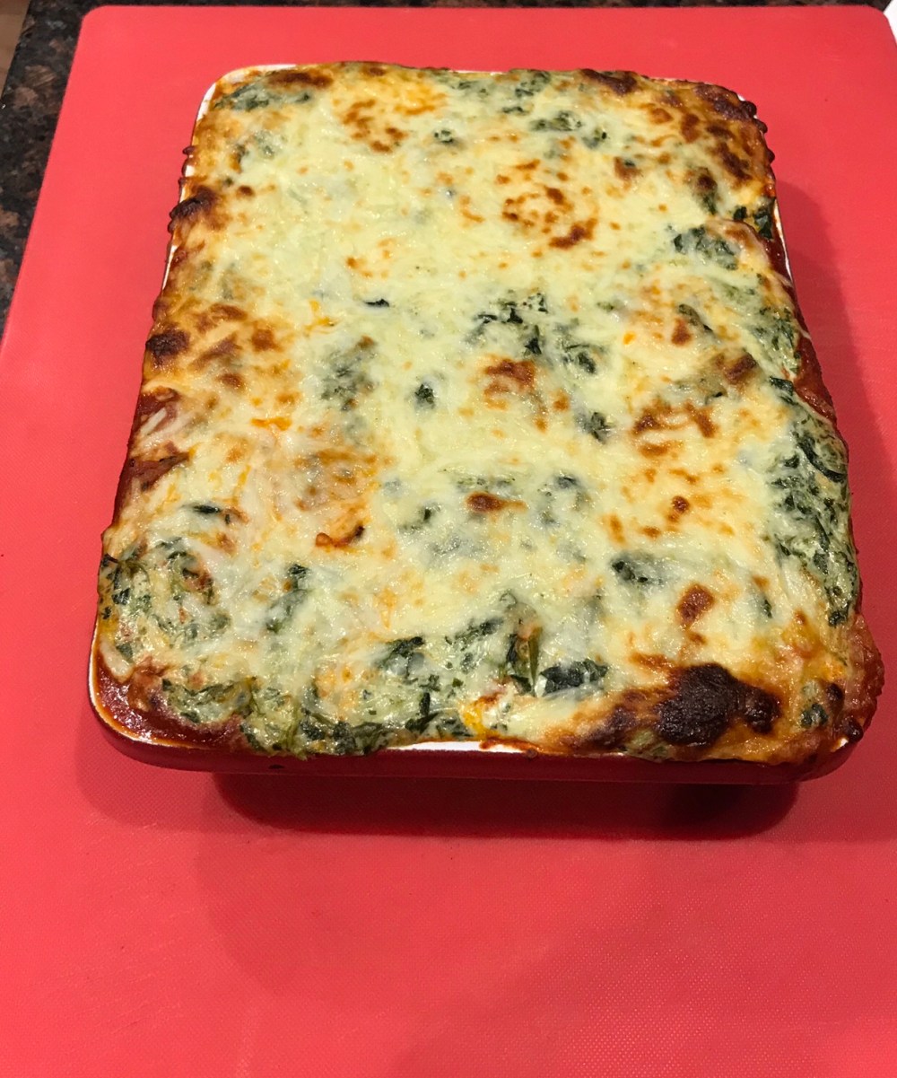 Assemble lasagna. Pour 1/4 cup marinara sauce to an 8×8 baking pan. Next a layer of meat noodle slices, spread more marinara sauce. Add spinach and cheese mixture on top. Cover with half of mozzarella cheese. Repeat with remaining ingredients, ending with mozzarella at the top.