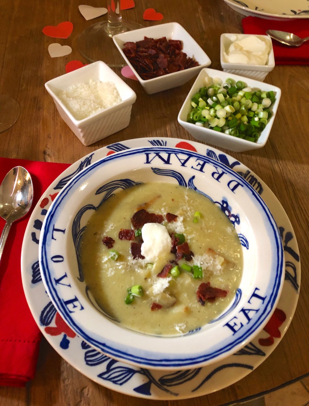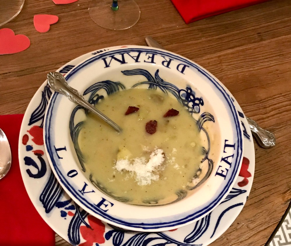 Church, Sunday naps, Mary Poppins, and yummy soup refreshed us this February day. I love potato soup and growing up loved Huey’s potato soup until we realized I couldn’t eat it due to the return of my infant allergies. I learned to replicate the thick creamy soup by puréeing half of the potatoes broth mixture without any other thickening ingredients. What I love about this recipe is that it is super simple and all about the toppings! I’ve shared my toppings below but you can add anything!