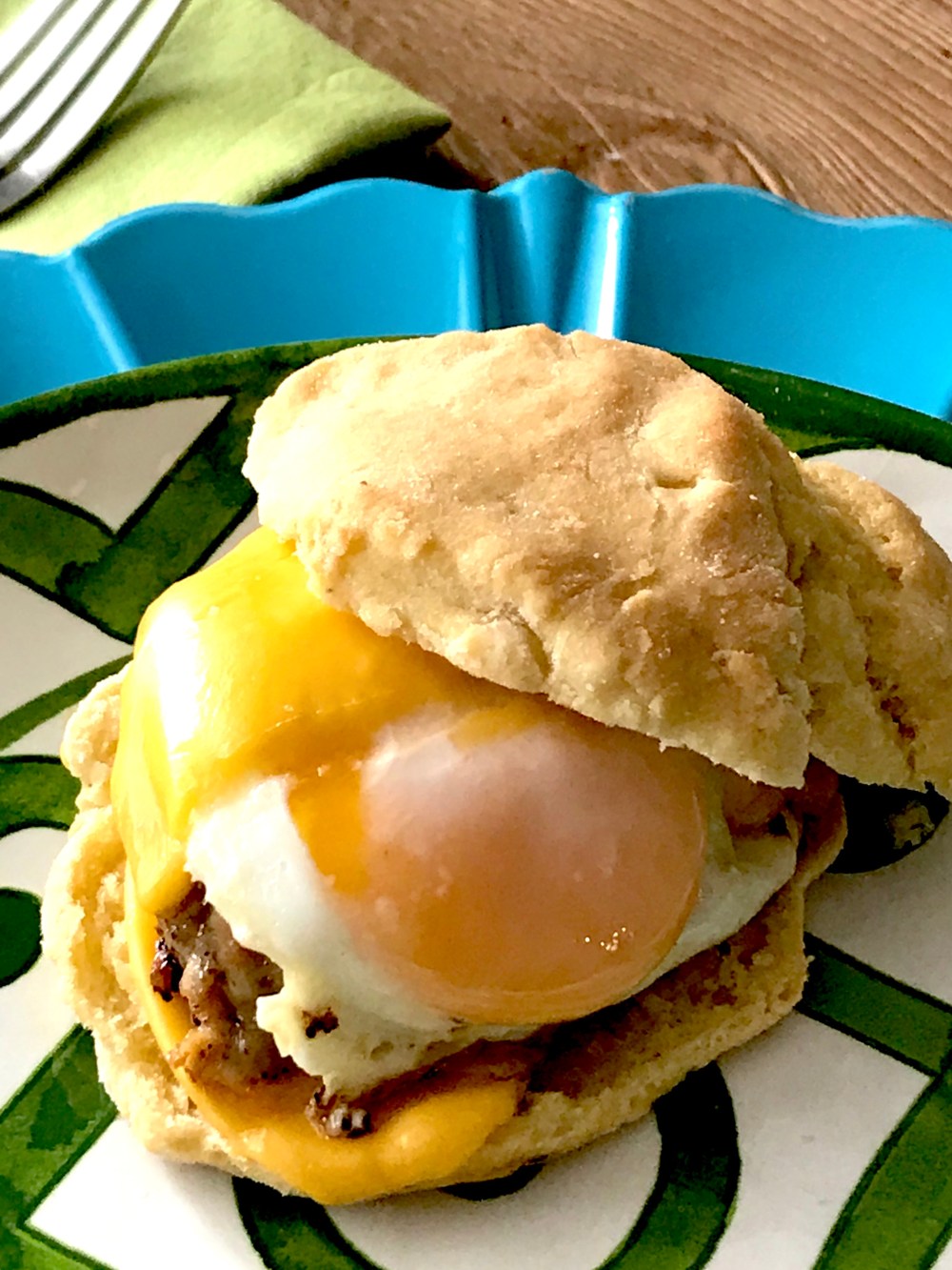 Today I updated our biscuit recipe to remove the goat yogurt since we recently learned that Shelton can no longer have table sugar and lactose. Previously we were told no cow dairy and now it seems no goat or sheep dairy either. This morning we had chicken sausage, egg & cheese biscuit! It was a hit.