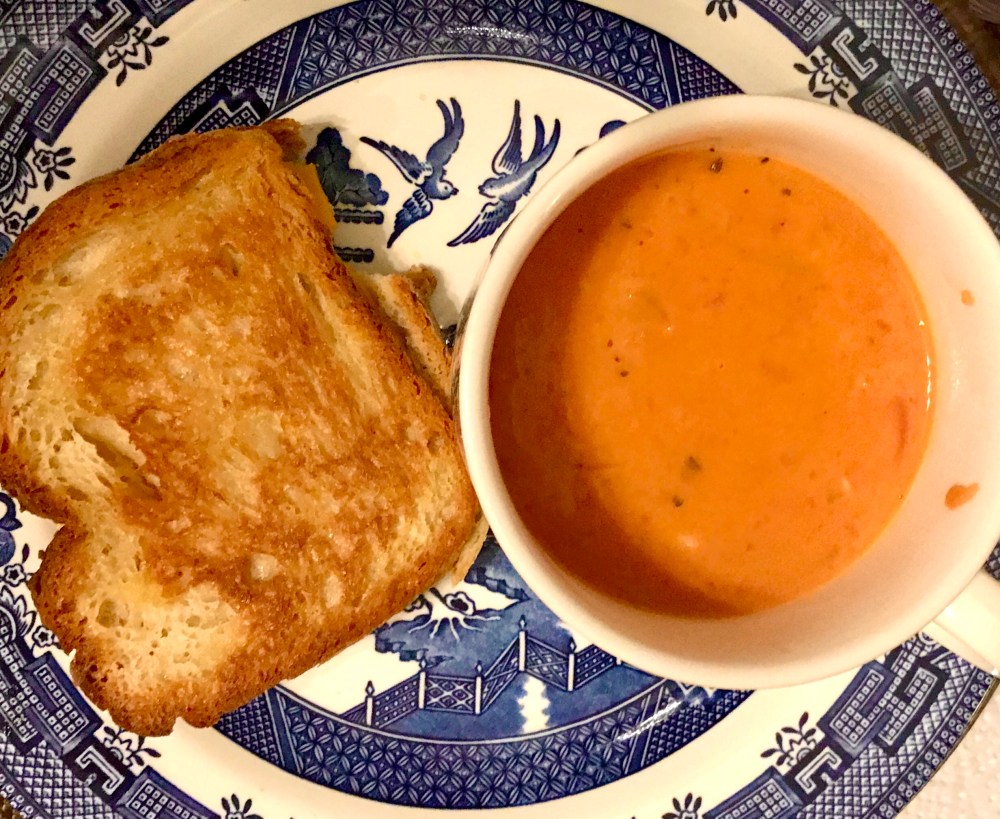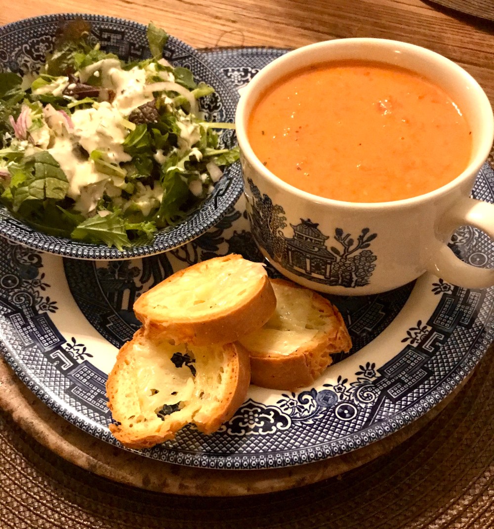 Sunday afternoons I try to cook things for the week. I made pumpkin oatmeal chocolate chip muffins (recipe below) and soup. Tonight it’s extra chilly and a perfect soup night. Tomato soup & grilled cheese were requested by my eight year old. She loves soup almost as much as I do. I didn’t have celery or carrots to go along with garlic & onions for my normal soup base. So I added extra onion & garlic. I truly believe with onions, garlic, & a can of coconut milk you can make soup from anything.