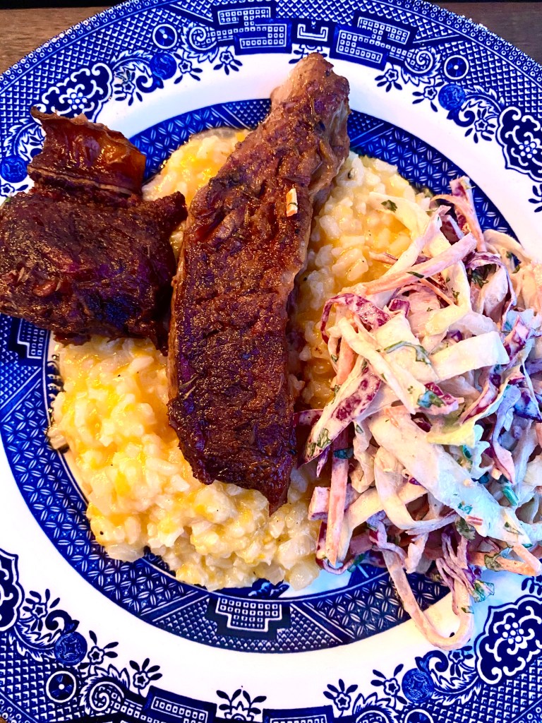 Our Sunset supper included smoked and braised beef short ribs, sweet potato risotto, smoked coleslaw, and fresh apple cake.