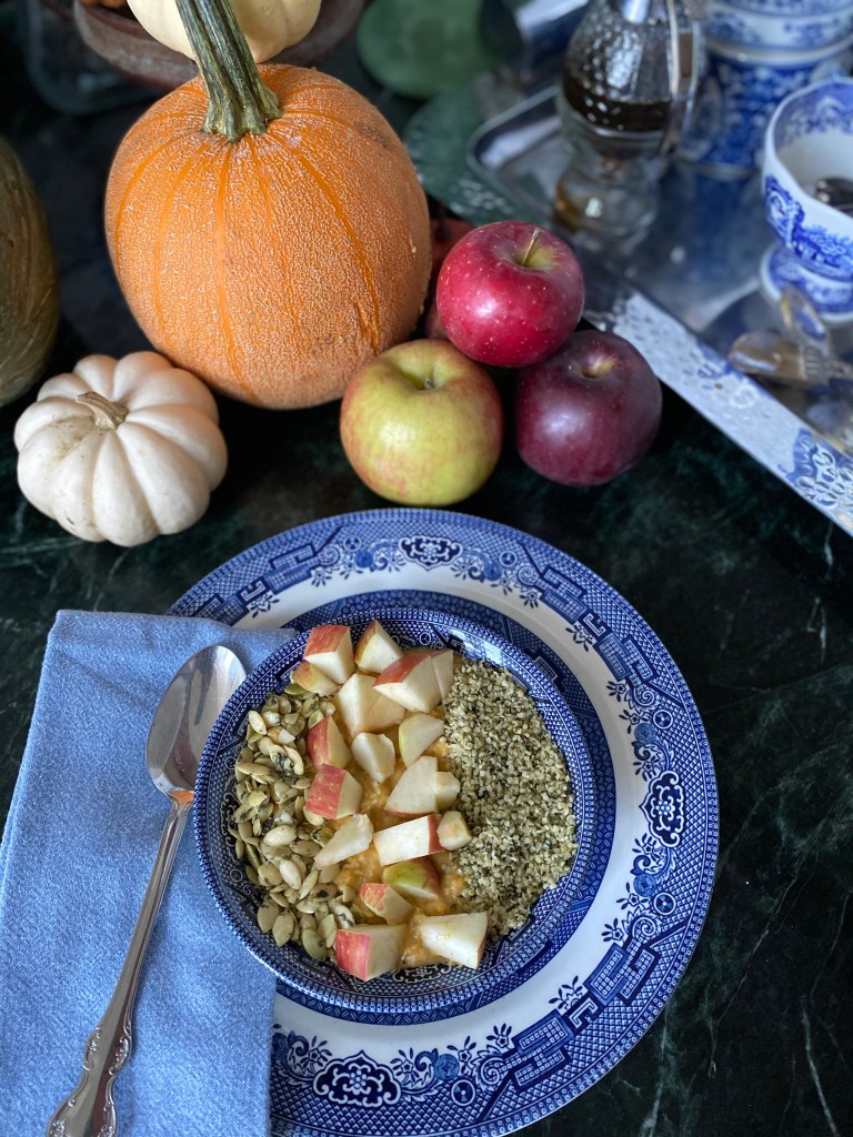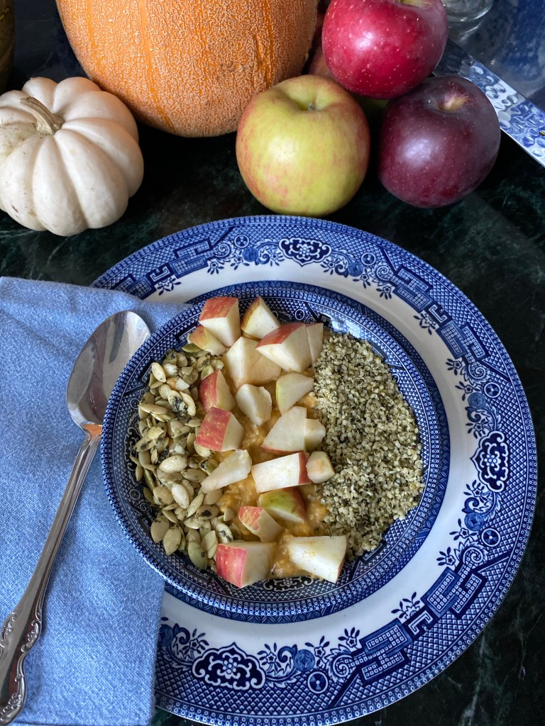 Yesterday I opened a can of pumpkin purée to make a pumpkin spice latte. So what to do with the rest? I’d made a pumpkin pie protein shake, pumpkin bisque, so why not pumpkin oatmeal. It feels like fall. Warm, yummy, and healthy.