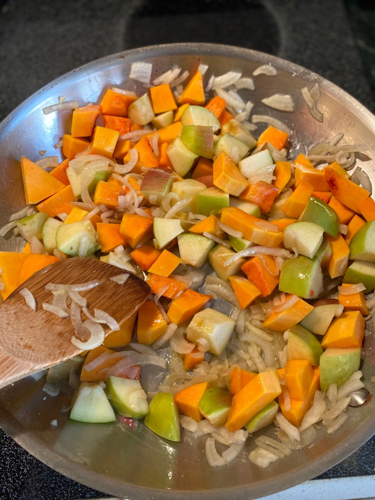 5. Add the butternut squash, apples, and garlic to the skillet and cover for 10 minutes stirring every few minutes to make sure nothing sticks.