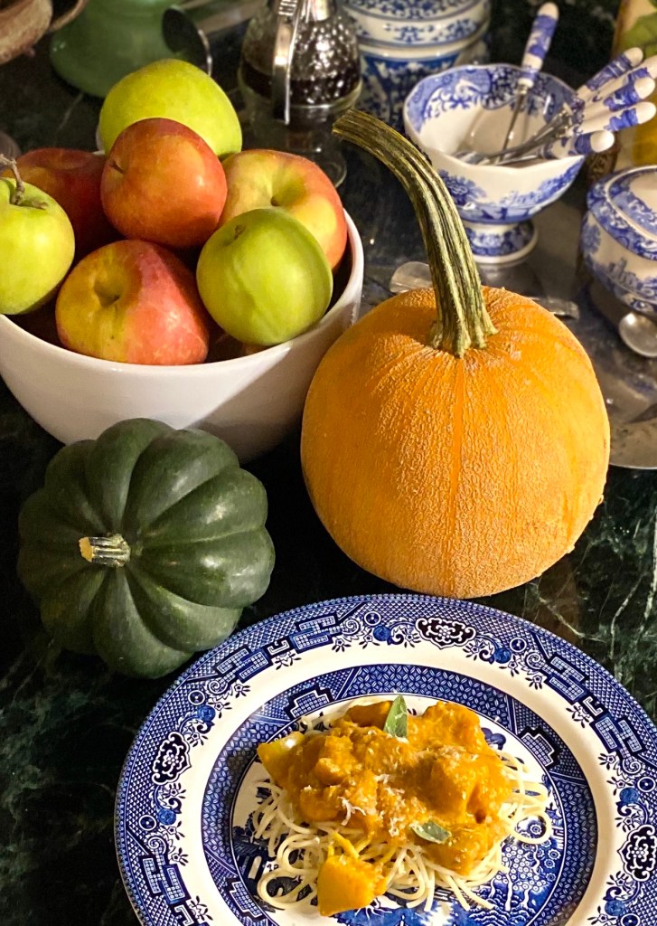 9. Place pasta on your plate. Spoon the apple, squash, pumpkin mixture on top of the pasta.