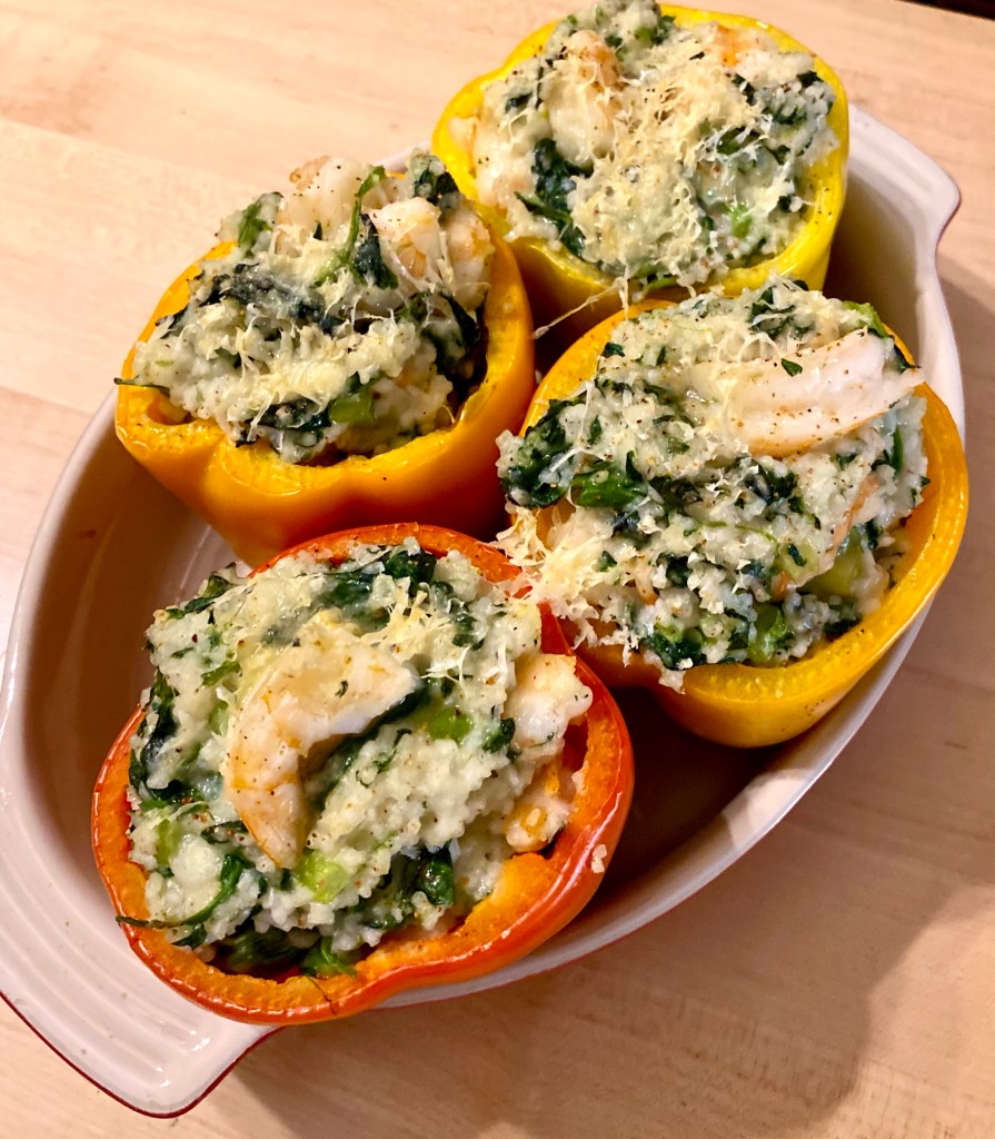 As I was prepping veggies for the week Scott sent me a link – 26 Shrimp recipes for Sunday dinner. Taking the hint I scrolled through seeing two recipes I liked. One-Pot Garlicky shrimp and spinach. The other shrimp & grits stuffed bell peppers. So I combined both recipes into one! It was delicious. Shelton asked to take one to school. No I’m not sending shrimp to school to stink up the classroom. Eating at your desk six feet away from anyone is hard enough without everyone wondering what’s in her lunch this time 😂