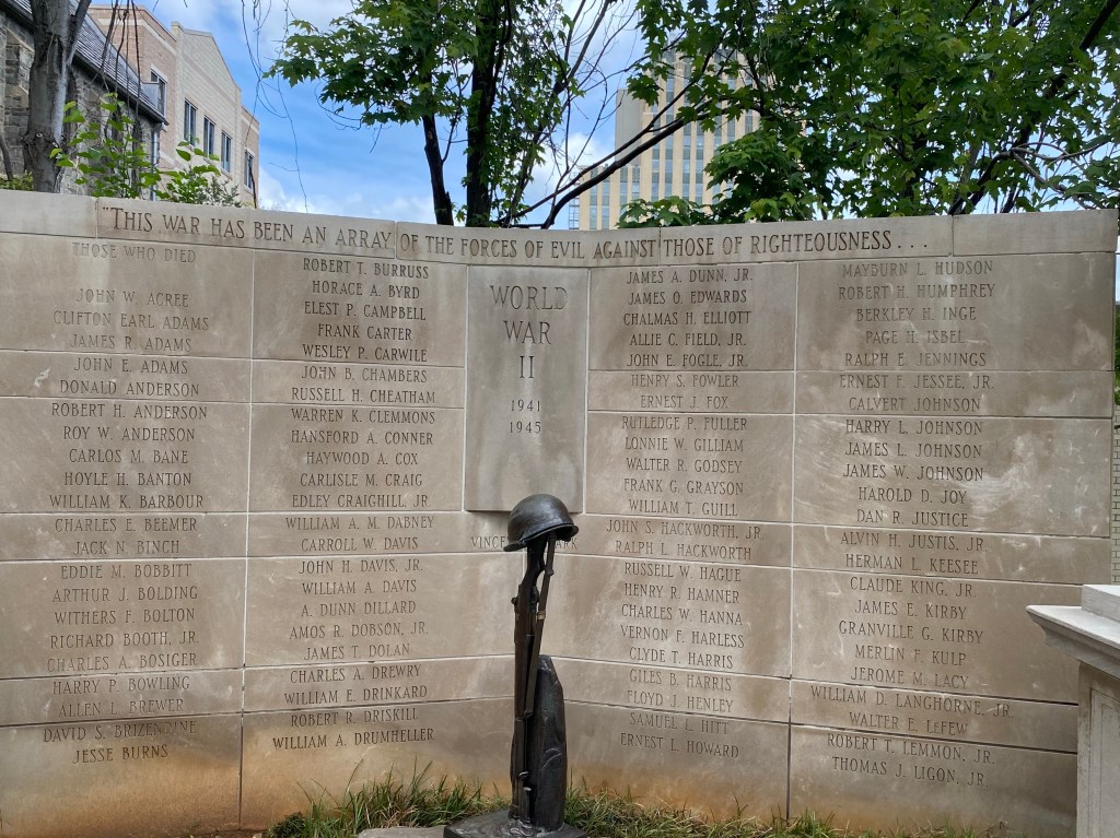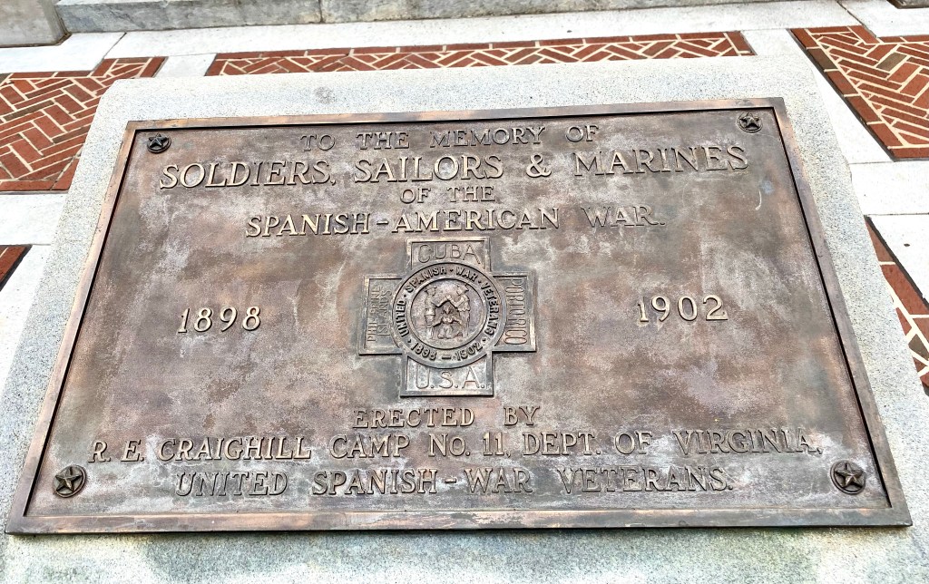 This evening we walked around the war memorials in downtown Lynchburg. It was a first for us. So many memorials on our short walk. Spanish American War. World War I.World War II. Korean War. Vietnam War.