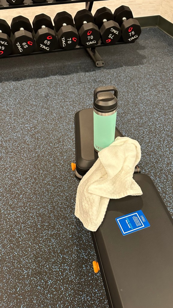 Exercising can be hard when you travel especially if you are in a different time zone and meetings run late. Most hotels offer a workout room, I try to get up early and spend 30 minutes in some form of exercise which is completely opposite from what I do at home. If I have 45 minutes I will walk on the treadmill 30 minutes and 15 minutes of weight training. If I only have 30 minutes I will walk for 15 minutes and lift weights for 15 minutes. This combination of cardio and strength training helps me feel my best.